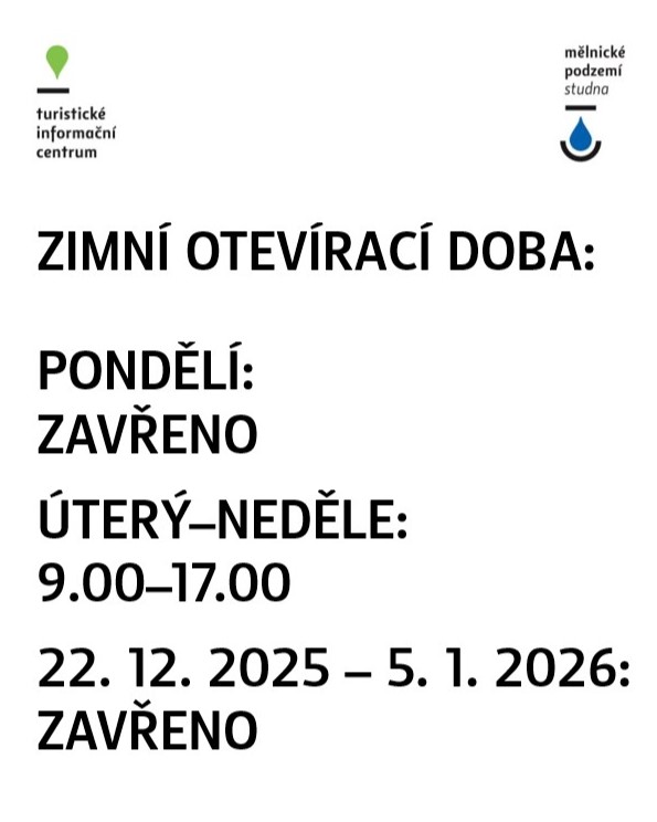 Vážení návštěvníci, upozorňujeme, že od 1. 12. platí v turistickém informačním centru Mělník a mělnickém podzemí zimní otevírací doba – tudíž pondělky vždy zavřené.